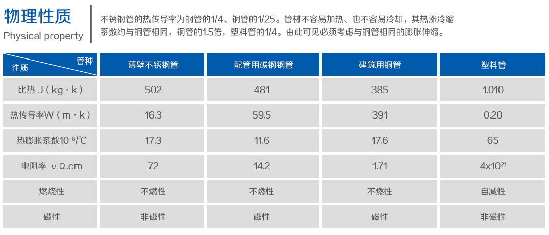 不銹鋼管的熱傳導(dǎo)率為鋼管的1/4、銅管的1/25。管材不容易加熱、也不容易冷卻,其熱漲冷縮系數(shù)約與銅管相同,銅管的1.5倍,塑料管的1/4。由此可見必須考慮與銅管相…